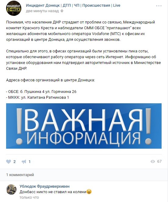 Красный крест и сотрудники ОБСЕ освоили в Донецке новый вид гуманитарной помощи — привезти немного Водафона.