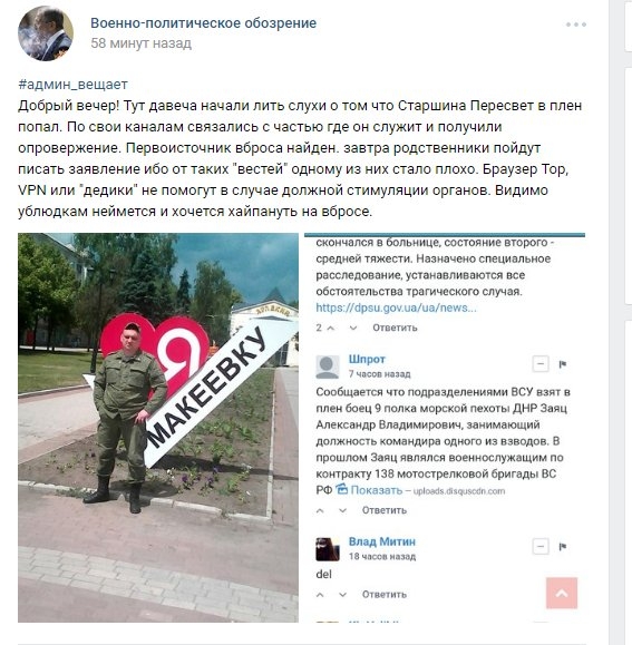 ОО «Миротворец» сообщает, что в марте ВСУ взяли в плен гражданина России Александра Зайца, который воевал в рядах сепаратистов. На Донбассе он воюет с конца мая 2014 года, а до этого успел отметиться в Чечне. На Донбассе этот террорист «дослужился» до командования взводом девятого полка так называемой «морской пехоты ДНР». В штабе АТО информацию пока не подтвердили. Сами террористы принялись тут же развенчивать эту новость, но живого и целого Пересвета пока не показали. Так что интрига сохраняется.