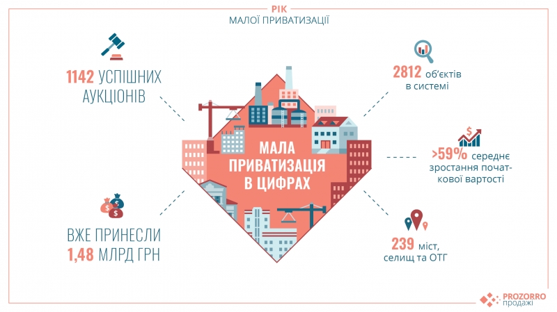 Малая приватизация государственного и коммунального имущества с момента старта принесла государству 1,48 млрд грн, сообщает пресс-служба ProZorro.Продажи. «Из них 39% на аукционы было выставлено Фондом госимущества на сумму свыше 570 млн грн. Органами местного самоуправления было организовано 61% от общего количества успешных аукционов, которые привлекли в свои бюджеты около 910 млн грн», — говорится в сообщении. Состоялось 1142 успешных аукциона, на которых были выставлены 2812 разнообразных объектов. В торгах приняли участие 2317 участников, которые конкурировали за каждый лот, что дало возможность повысить стартовую цену в среднем на 59,64%.
