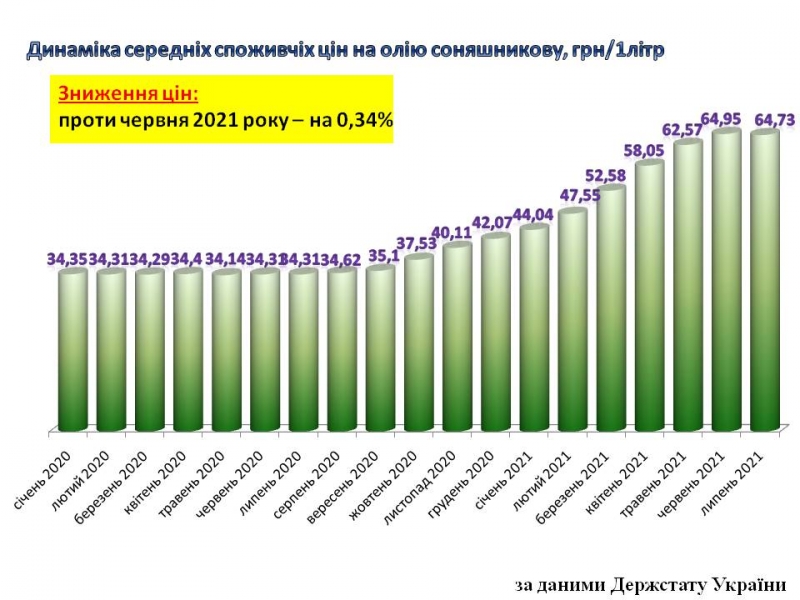 И о неожиданном — пресс-служба ассоциации «Укролияпром» сообщает, что впервые за год снизились потребительские цены на литр подсолнечного масла. В июле этот показатель уменьшился на 22 коп (-0,34%) по сравнению с июнем. При этом по сравнению с июлем 2020-го подсолнечное масло было на 99,3% дороже.