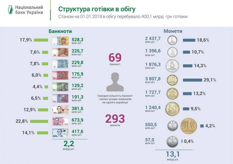 В Украине в обороте по состоянию на 1 января 2019 года находилось наличности на общую сумму 400,1 млрд грн. Как сообщает пресс-служба регулятора, из этой суммы монет — 2,2 млрд грн (13,1 млрд штук); банкнот — 397,8 млрд грн (2,95 млрд штук). Это на 10,7% больше, чем на начало прошлого года (361,5 млрд грн по состоянию на 1 января 2018 года). Среднее количество банкнот на одного украинца составляло 69 штук, а разменных монет — 293 штуки (по состоянию на 1 января 2018 года — 70 банкнот и 293 разменные монеты соответственно). Больше всего по количеству в наличном обращении находится банкнот номиналом 200 гривен и разменных монет номиналом 10 копеек (22,8% и 29,1% соответственно), сообщает НБУ в Facebook.