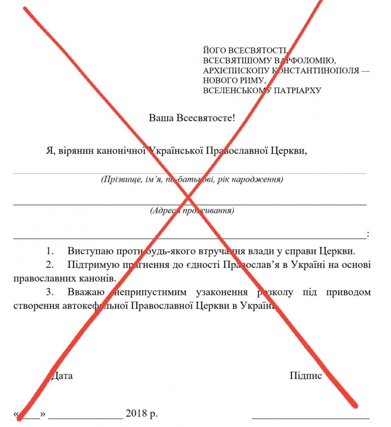 «Миротворец» сообщает о том, что Московский патриархат решил в очередной раз сыграть на простодушности украинцев и предлагает им подписать заранее распечатанные заявления о том, что они выступают против «вмешательства власти в церковь» и за всё хорошее сохранение текущего положения. А третьим пунктом уже идёт истинное требование, ради которого и составлялась бумажка — против автокефалии и за гнёт Москвы. Также в центре пообещали в ближайшем будущем опубликовать переписку авторов этой акции.