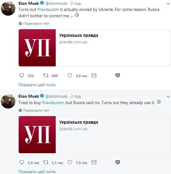 А Илон Маск открывает секреты украинских медиа — УП принадлежит России. Ну не то, чтобы «принадлежит», Илон. Всего лишь финансируется. Заплатишь больше — станут твои, они в целом недорогеньки.