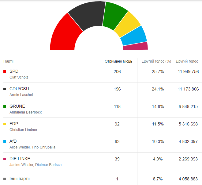 Социал-демократическая партия Германии выиграла выборы в Бундестаг. Социал-демократическая партия Германии получила 25,7% голосов, Блок Христианско-демократического и Христианско-социального союзов занял второе место с самым низким за свою историю результатом 24,1% голосов (у ХДС (CDU) 18,9%, а у ХСС (CSU) 5,2%). На третьем месте расположились партия «Зелёные» с 14,8%, на четвёртом ― Свободная демократическая партия с 11,5%, а «Альтернатива для Германии» стала пятой с 10,3%. Также в парламенте будет фракция «Левой партии», которая не преодолела 5%-й барьер, но за счёт дополнительных прямых мандатов набирает минимально необходимое количество мест.