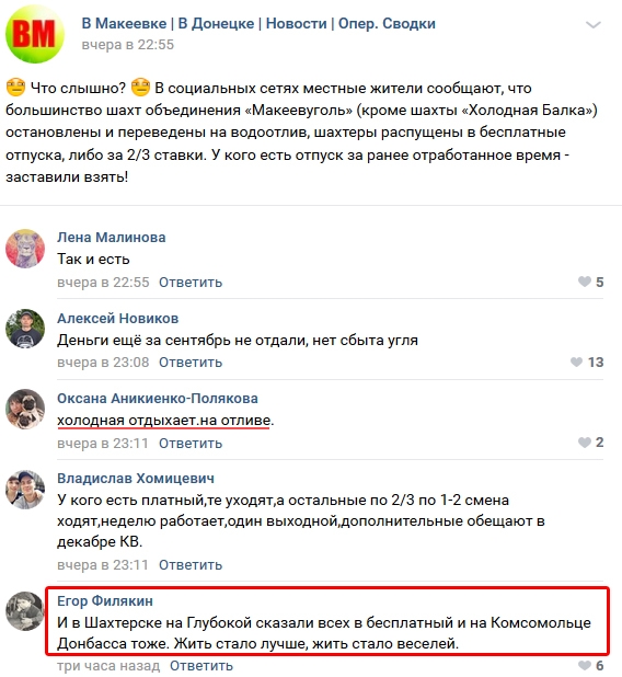 Тем временем шахтёры Макеевки почти полностью спасли себя от того, что «придут бандеровцы и позакрывают шахты». Чем-то напоминает социальное харакири.