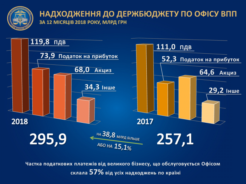 У 2018 році великими платниками податків сплачено до державного бюджету майже 296 млрд грн, що на 38,8 млрд грн або 15,1% більше ніж торік. Зазначається також значне зростання надходжень до держбюджету по податку на прибуток, які цьогоріч склали рекордні 73,9 млрд грн, що на 21,5 млрд або 41,3% більше, аніж у 2017-му.