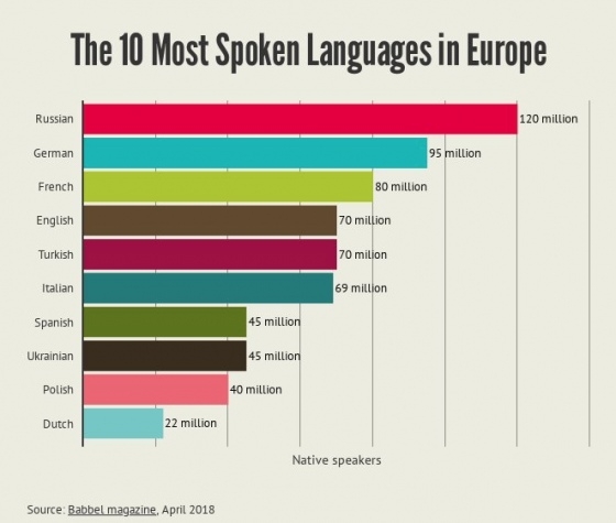Російська, німецька та французька - найбільш широко вживаються серед населення Європи. Після трійки лідерів в списку розташувалися англійська, турецька та італійська. Наступні рядки зайняли іспанська, українська та польська. Десятку лідерів замикає нідерландська мова.