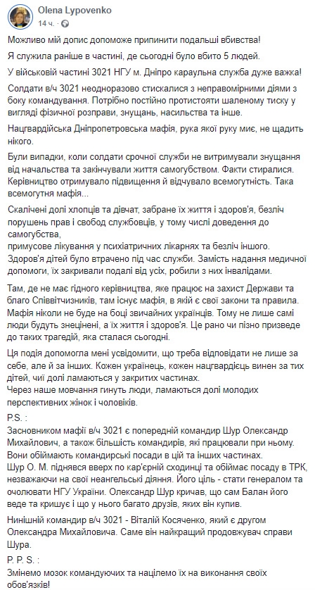 В Facebook появились посты как от волонтёров, так и от экс-военнослужащих НГУ, в которых говорится одно и то же — солдаты в/ч 3021 неоднократно сталкивались с неправомерными действиями со стороны командования. Включая физическую расправу и издевательства. Некоторые даже покончили с собой.