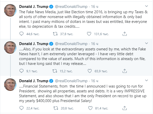 После появления статьи глава Белого дома заявил, что на самом деле платил в казну миллионы долларов. Комментируя сообщения о сотнях миллионов долгов, которые до сих пор висят над ним, Трамп заявил, что это «очень мало по сравнению со стоимостью его активов». Он также заявил, что является единственным среди всех предшественников президентом, который отказался от свыше 400 тыс. долл. ежегодной президентской зарплаты.