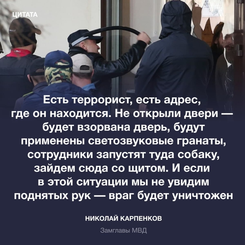 В КГБ Беларуси, подконтрольном режиму Лукашенко, подтвердили ― их сотрудник был убит во время «специальных мероприятий по отработке адресов, в которых могли находиться лица, причастные к террористической деятельности». Глава режима Беларуси уже заявил, что «безнаказанным это не останется», при том, что даже официально подтверждено ― мужчина, в дом которого вломилось КГБ, был убит. А в Генпрокуратуре уже заявили ― мол, силовики при применении оружия действовали в рамках законодательства. А глава МВД режима Лукашенко накрутил градус агрессии до такой степени ― видимо, террористом, будут назначать уже постфактум любого, кто не поверил человеку в штатском, заявившему, что он из силовых органов.