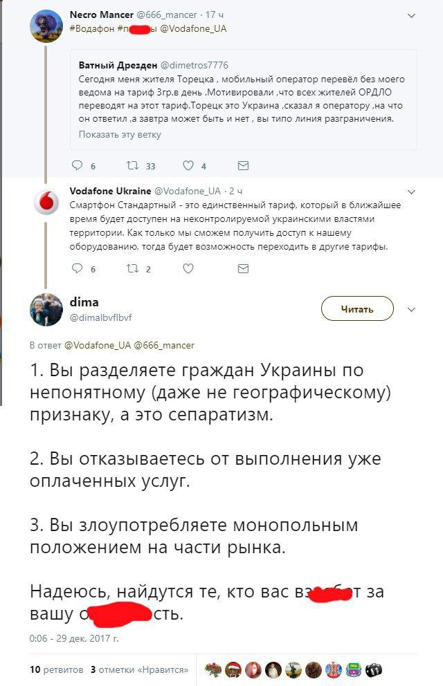 С 9 января 2018 года абоненты мобильного оператора Vodafone Ukraine, проживающие в подконтрольных боевикам районах Донбасса, будут автоматически переведены на тариф «Смартфон Стандартный», сообщают «Новости Донбасса». Правда, настроены в Водафоне пессимистично и к таким районам отнесли прифронтовые Авдеевку и Торецк, которые находятся под нашим контролем. Конкретные причины, по которым ряд абонентов из этих населённых пунктов были уведомлены о смене тарифа в Vodafone Ukraine, можно сказать, не называют. Точнее — пытаются, но выходит у них так себе.