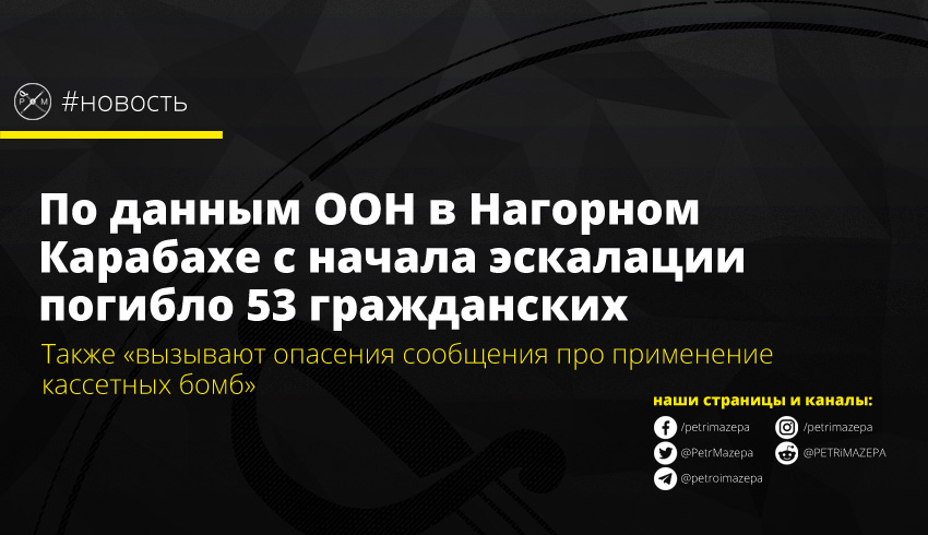 Верховный комиссар ООН по правам человека Мишель Бачелет сегодня опубликовала доклад, согласно которому в Нагорном Карабахе с 27 сентября по 8 октября включительно погибли в результате боевых действий не мене 53 мирных граждан.