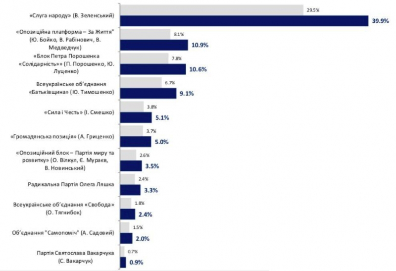 Объявленная, но еще не зарегистрированная партия Святослава Вакарчука набрала бы 0,7% голосов опрошенных (0,9% тех, кто определился), а также все остальные представленные в опросе партии набрали бы менее 0,5% голосов избирателей.