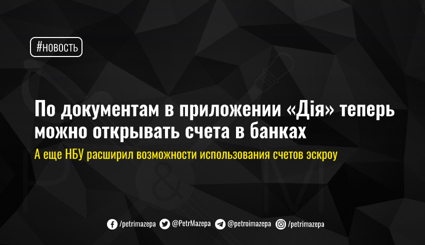 НБУ нормировал ряд вопросов, связанных с открытием банковских счетов. В частности, регулятор разрешил при открытии счетов предъявлять банковскому работнику е-паспорт, е-паспорт для выезда за границу, е-свидетельство о рождении и данные о регистрационном номере учетной карточки плательщика налогов с использованием мобильного приложения «Дія».