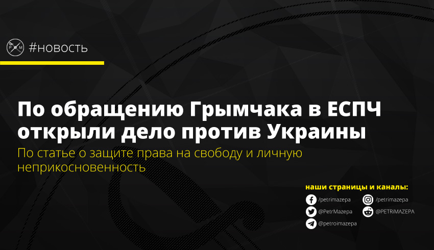 ЕСПЧ открыл дело, которое касается нарушений п. 1 и п. 2 ст. 5 Конвенции о защите прав человека и основных свобод, сообщает адвокат Грымчака Дмитрий Мельник в Facebook. Он также выложил в сеть соответствующий документ от секретариата ЕСПЧ от 2 июня.