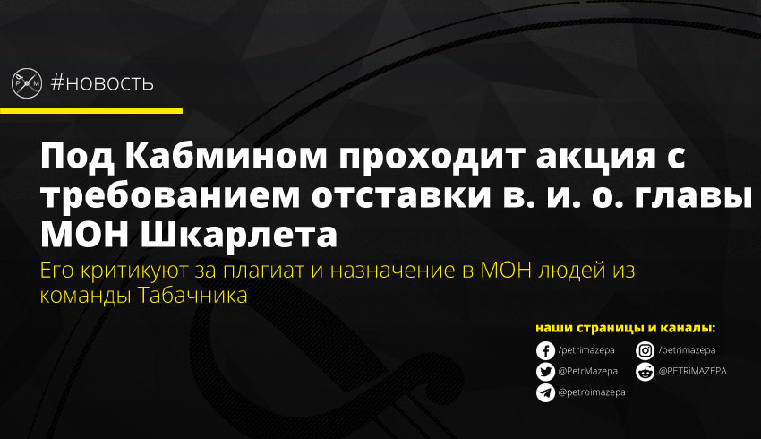 Под Кабинетом министров проходит акция с требованием отправить в отставку временно исполняющего обязанности главы Министерства образования и науки Сергея Шкарлета. Его критикуют как за наличие признаков плагиата в научных трудах, так и за назначение на должности в МОН людей из команды министра образования и науки времен Януковича Табачника.