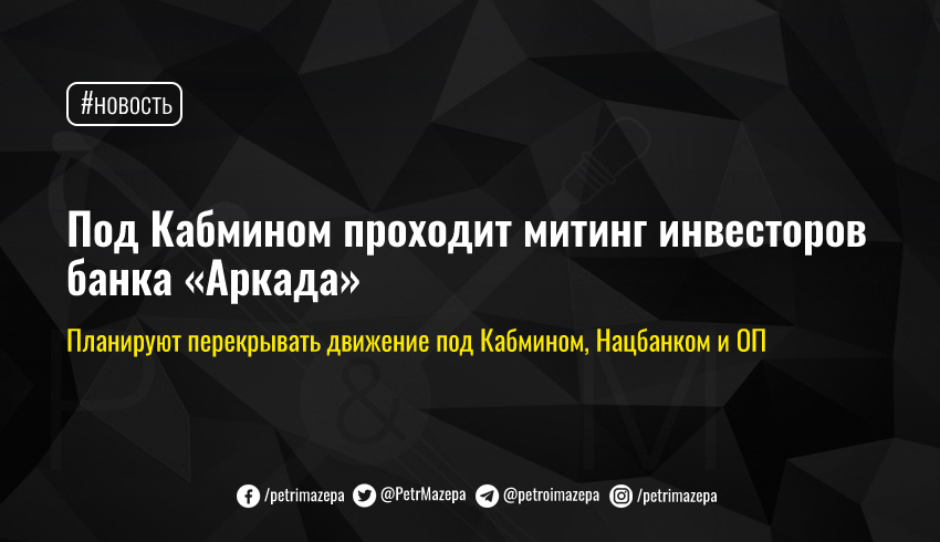 Инвесторы банка «Аркада» планируют сегодня провести митинги с перекрытием движения под Кабинетом Министров, Национальным банком и Офисом Президента, передает «Укринформ». Своими действиями люди хотят побудить высшее руководство государства назначить дату и время проведения брифинга с публичным подписанием Меморандума о взаимодействии и сотрудничестве при восстановлении и завершении строительства жилых комплексов, возводимых банком «Аркада».