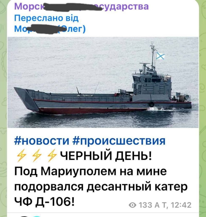 Под Мариуполем на мине подорвался десантный катер ЧФ России Д-106.
