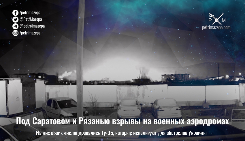 Сегодня рано утром на военном аэродроме в Энгельсе (пригород Саратова) был мощный взрыв, который был виден за километры от эпицентра. Российские власти пока не сообщают о масштабах повреждений, отделываясь фразами про «военные проверяют». Кроме того, был взрыв и на военном аэродроме под Рязанью. Тут масштабы были поменьше и уже известно про трех погибших.