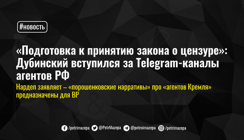 «Подготовка к принятию закона о цензуре»: Дубинский вступился за Telegram-каналы агентов РФ