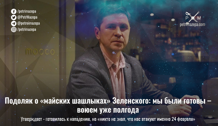 Советник главы Офиса президента Михаил Подоляк в интервью «Фактам» прокомментировал январскую фразу президента Украины Владимира Зеленского о «майских шашлыках». Говорит, что к войне были готовы и поэтому уже «полгода, как мы воюем» (вот тут ВПЛ первой волны удивились – что же тогда началось в 2014-м).