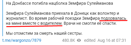 В первых сообщениях о смерти начинавшей пропагандистски сообщалось, что Сулейманова «приехала в Донецк как волонтер и журналистка. Во время рабочей поездки Земфира подорвалась на мине вместе с водителем».