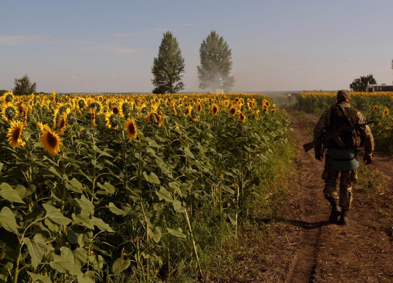 Утром крадёшься между посадкой и низкорослыми подсолнечниками высотой максимум по пояс, ищешь дозорного с тепляком. Его нет, похоже, свалил. Двигаешься с товарищем вдоль подсолнечника к ближайшей населёнке, поглядеть, что там, кто там, найти воды и помощь для раненых. Радуешься, когда видишь свой флаг над высоким зданием вдалеке, и огорчаешься, узнав от местных, что нет уже никого и скоро тут будут чужие. Выход к людям и населёнке, взяв в руки две эфки — чтобы наверняка — это тоже подсолнечное поле.