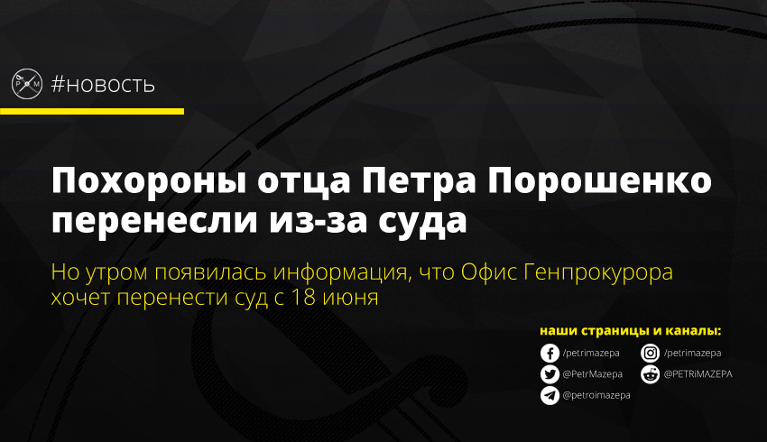 Адвокат Петра Порошенко Илья Новиков сообщил, что «Страна.юа» опубликовала в своем Telegram-канале фейковую информацию о том, что генпрокурор Венедиктова якобы проинформировала адвокатов Порошенко о том, что заседание суда переносят с 18 июня для того, чтобы Порошенко мог успеть на похороны своего отца.