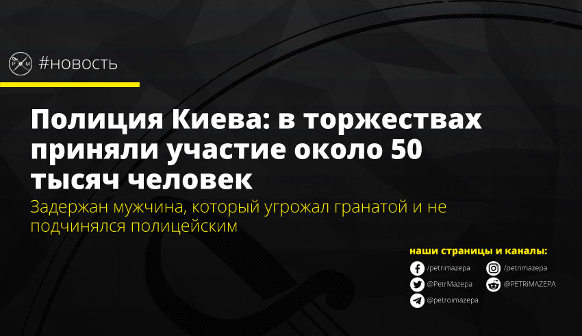 Начальник ГУ Нацполиции в Киеве Андрей Крищенко сообщил, что в торжествах в честь Дня независимости приняли участие около 50 тысяч человек. Празднование прошло без серьезных нарушений. Один человек, который отказался подчиняться требованиям полицейских и угрожал гранатой, был задержан, еще у двух людей выявили вещество, похожее на каннабис, их также задержали, и телефонный террорист «заминировал» площадь Независимости.