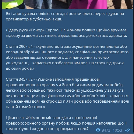 Полиция сообщила лидеру движения «Гонор» Сергею Филимонову подозрение. Филимонов был одним из организаторов акции в субботу.