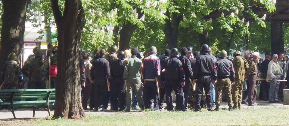 Вот еще один человек в милицейской каске, раздает ценные указания одной из сторон конфликта.