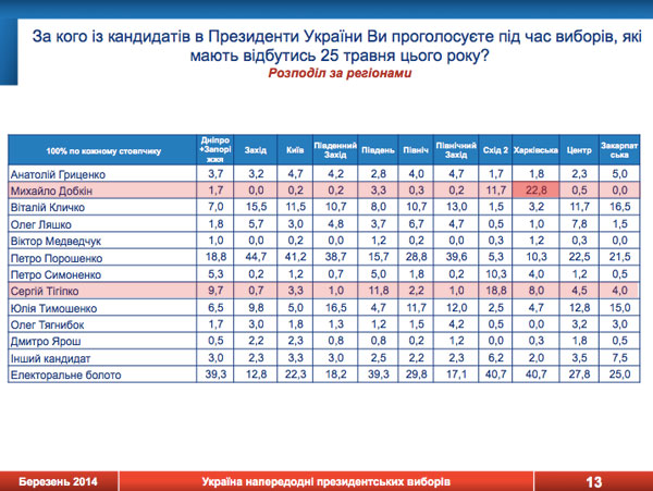 6. Сам Порошенко – однозначный лидер президентской гонки. Соцопросы рисуют ему больше 20% рейтинга на старте. Во всех западных регионах он уверенно бьет всех оппонентов. На востоке ситуация похуже, но все равно, грубо говоря, приемлемая. Поэтому основная работа для Порошенко будет заключаться в том, чтобы убедить электоральное болото Юго-Востока голосовать за себя.
