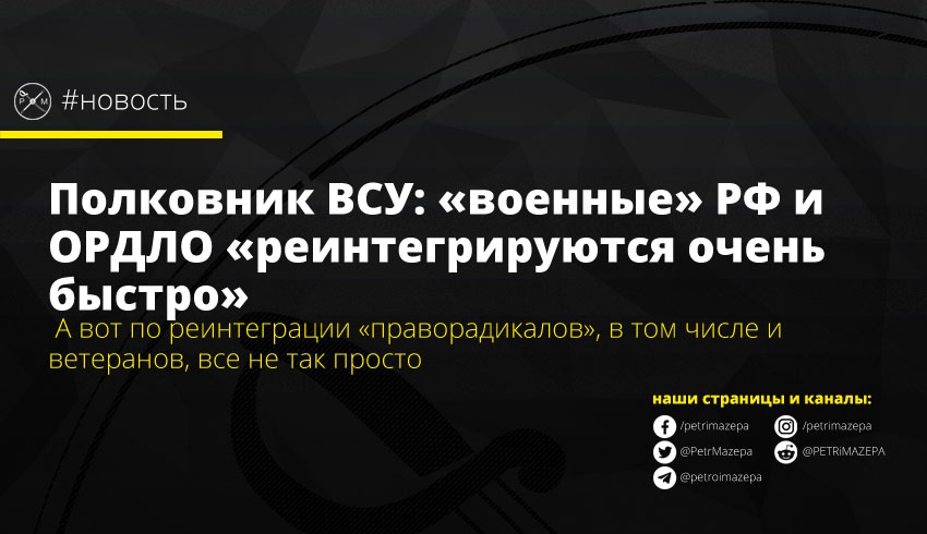 Начальник Управления гражданско-военного сотрудничества ВСУ полковник Алексей Ноздрачев заявил, что военные россияне, а также «те военные, которые есть в формированиях Донецкой и Луганской областей» могут реинтегрироваться очень быстро, если будет принято и имплементировано политическое решение. А вот «праворадикализм», который сейчас «бесконтролен», не так прост – потому что госполитики по реинтеграции именно этих ветеранов нет.
