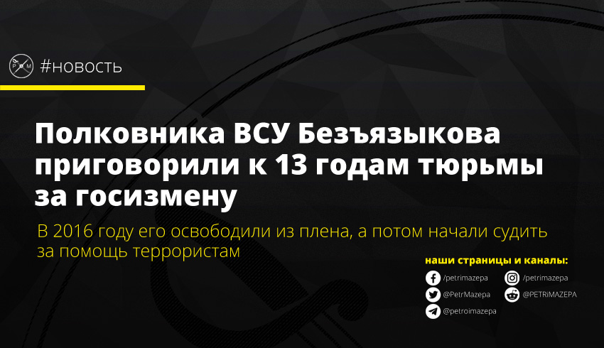 Шевченковский суд Киева приговорил к 13 годам тюрьмы полковника ВСУ Ивана Безъязыкова. Его судили и признали виновным по статьям о государственной измене и создании террористической группы (ч.1 ст.111, ч.1 ст.258-3 УК Украины). Сам Безъязыков утверждает, что террористы держали его в плену с 2014 по 2016 год, и принуждали выполнять определенные работы.