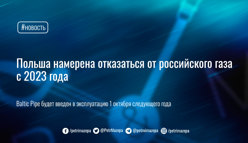 Как сообщает Euractiv, газопровод Baltic Pipe введут в эксплуатацию 1 октября следующего года.