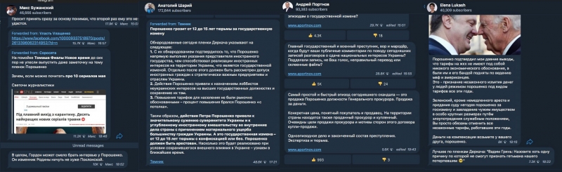 Или вот такая: «У нас нет сомнений, что необходимо интенсивно реализовывать реформы. Однако нам нужно проводить реформы таким образом, чтобы у людей было к ним доверие. Потому что если людей не будут доверять реформам, их нельзя будет воплотить в жизнь». Кто-то поспешил с нарезкой: обе якобы принадлежат экс-президенту Порошенко, и обе не вписываются в общий месседж о его государственной измене. Именно о таких выводах буквально вопят пророссийские СМИ и телеграм-каналы Украины. Но о них позже.