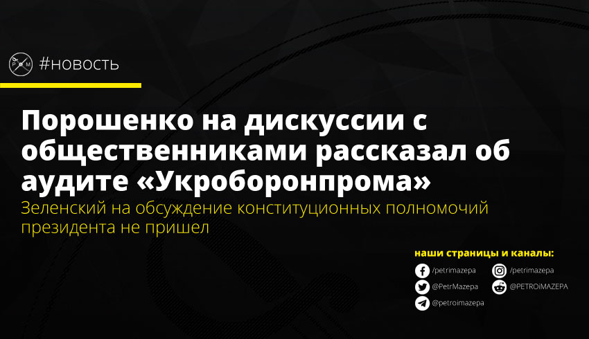 Во время публичной дискуссии с представителями гражданского общества и экспертной среды президент Украины Петр Порошенко сообщил, что аудит «Укроборонпрома» уже запущен, и проводить его будет всемирно известная компания.  Кандидат в президенты Владимир Зеленский на встречу не явился.