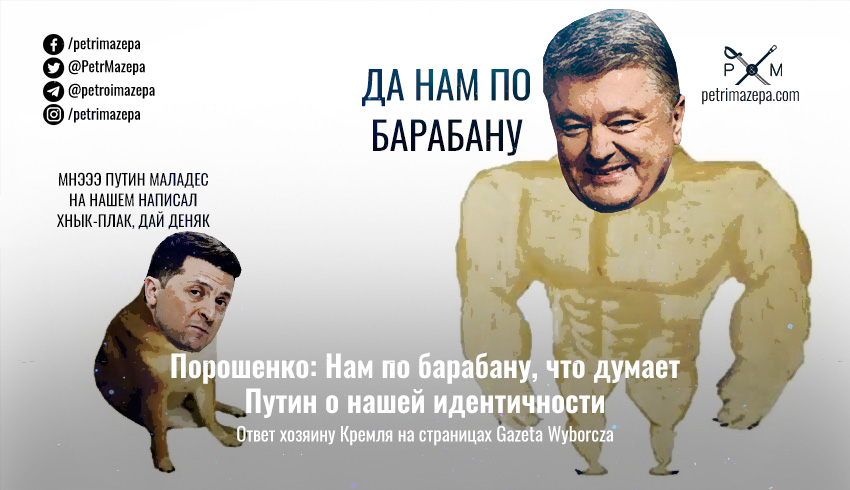 «Мы, украинцы, не имеем проблем с собственной идентичностью. И нам по барабану, что именно об этом думает Путин. Мы украинская политическая нация, равноправными членами которой являются граждане разного этнического происхождения, разных конфессий и языковых сообществ. И от россиян нас отличают не только собственный исторический опыт, язык, песни и танцы или кухня, но и политическая культура, отношение к правам и свободам человека, геополитические ориентации, осознанное и глубоко укоренившееся чувство причастности к европейской цивилизации. Эти различия в течение последних семи лет только усилились, и, кстати, не последнюю роль в ускорении процесса сыграл чрезвычайно отталкивающий для Украины Путин», - цитирует Порошенко пресс-служба.