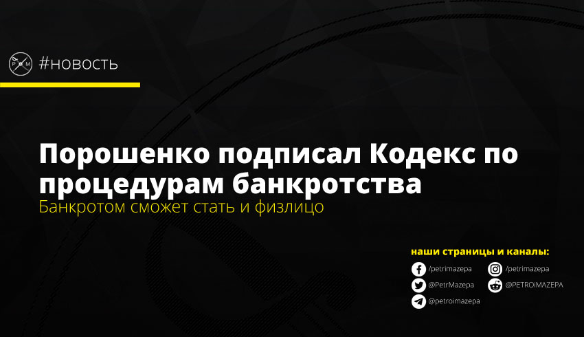 Президент Украины Петр Порошенко одобрил Проект Кодекса по процедурам банкротства, принятый Верховной Радой в октябре прошлого года. Согласно Кодексу, банкротом в Украине сможет объявить себя в том числе и физическое лицо, причем исключительно по собственному заявлению.