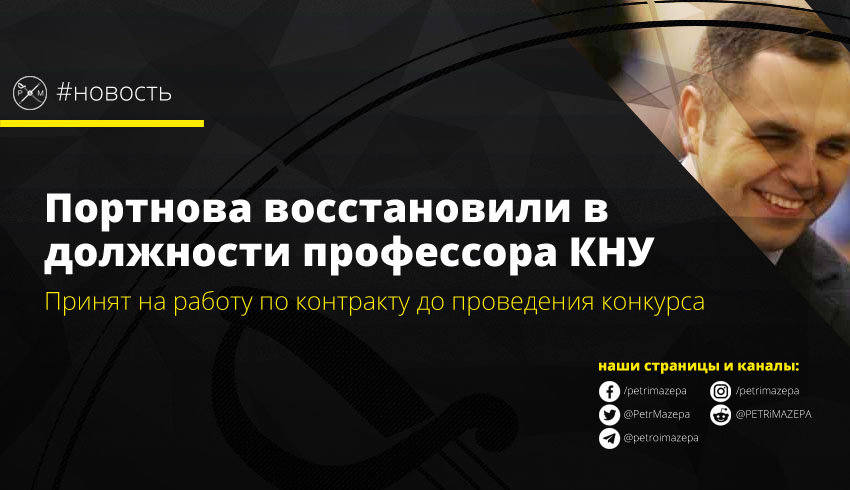 Об этом сообщают «Українські Новини» со ссылкой на приказ ректора Губерского. По данным издания, на работу Портнов принят до 30 июня 2020 года. Его оклад составляет 14753 грн, установлены доплаты в 25% за ученое звание, в 25% за научную степень, 20% за звание «Заслуженный юрист Украины», и 10% за выслугу лет.