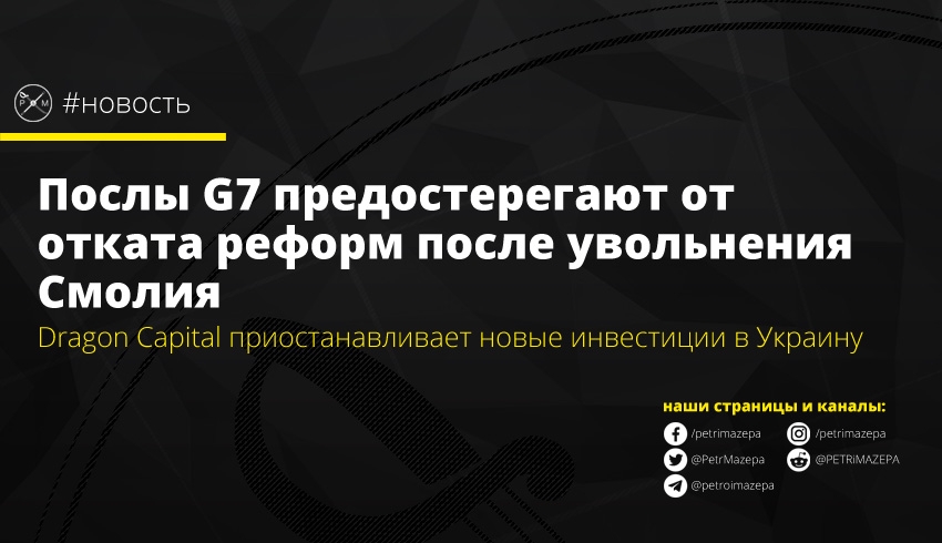 После заявления Якова Смолия об отставке с должности главы Нацбанка гендиректор инвесткомпании Dragon Capital Томаш Фиала заявил, что приостанавливает новые инвестиции в страну. А в G7 заявили, что отставка главы НБУ может представлять угрозу надежности реформ в Украине.