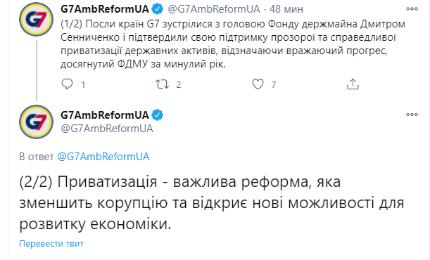 Как говорится в заявлении послов G7 в Twitter, они «подтвердили свою поддержку прозрачной и справедливой приватизации государственных активов, отмечая впечатляющий прогресс, достигнутый ФГИУ за прошлый год».