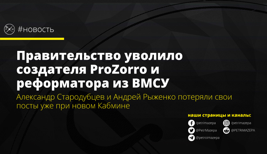 Сегодня стало известно, что Кабинет министров уволил одного из создателей электронной системы ProZorro Александра Стародубцева с должности главы Национального агентства по вопросам государственной службы. А новый министр обороны Андрей Таран уволил бывшего замначальника штаба ВМСУ по евроинтеграции капитана первого ранга Андрея Рыженко, который при Андрее Загороднюке был помощником министра.
