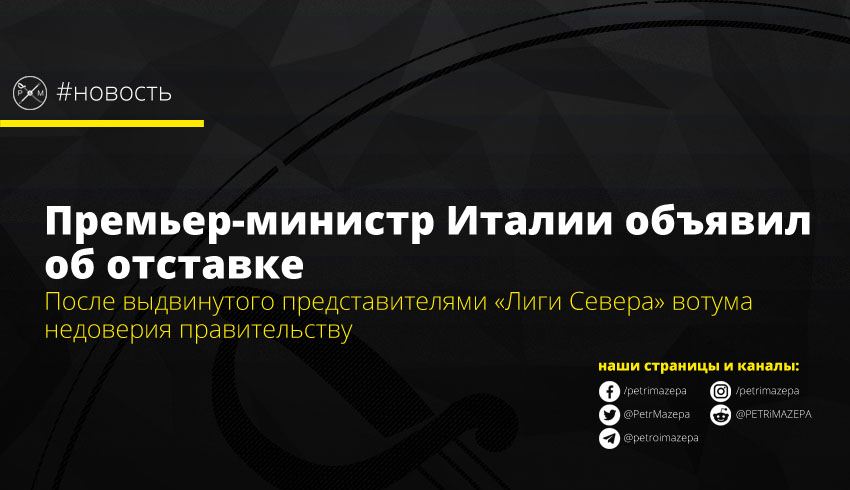 Премьер-министр Италии Джузеппе Конте объявил о своем решении уйти в отставку после того, как вице-премьер-министр Маттео Сальвини из «Лиги Севера» поднял вопрос о доверии к правительству. По мнению Конте, Сальвини после выборов в Европарламент искал предлог для новых выборов, и поставил свои интересы выше государственных.