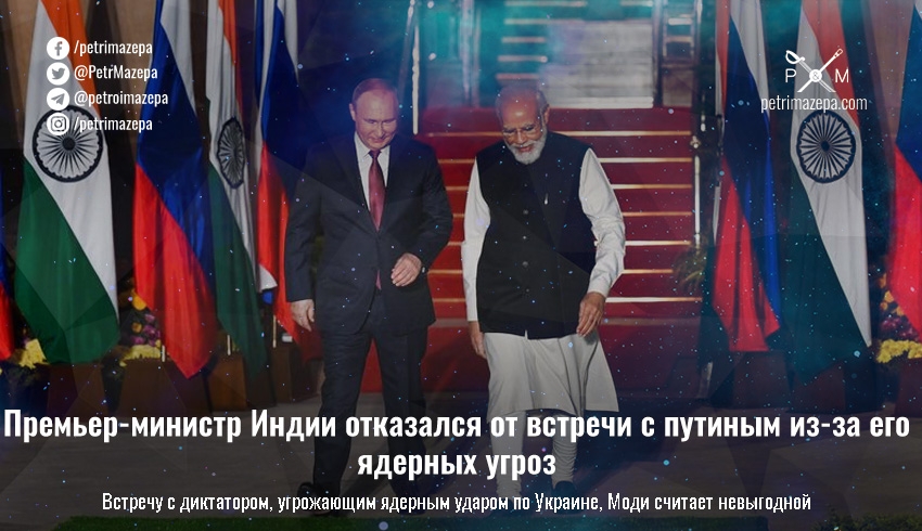 Премьер-министр Индии Нарендра Моди отказался от встречи с диктатором РФ путиным из-за его угроз применить ядерное оружие на войне против Украины. Это будет лишь второй раз, когда лидеры Индии и страны-агрессора не встретятся лично с 2000 года – в 2020 году встреча была единственный раз отменена из-за пандемии.