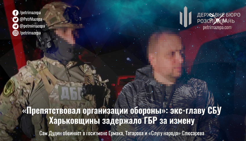 Государственное бюро расследований задержало экс-главу управления Службы безопасности Украины в одной из областей — его обвиняют в госизмене и умышленном препятствии организации обороны области. Дело было открыто против Дудина Романа, который на 24 февраля этого года был руководителем УСБУ Харьковщины, он сам это признал и обвинил Офис президента Украины в преследовании, а Ермака и других — в работе на ФСБ.