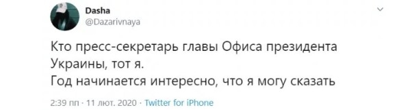 «Кто пресс-секретарь главы Офиса президента Украины, тот я. Год начинается интересно, что я могу сказать», — написала Заривная в своем защищенном Twitter-аккаунте.