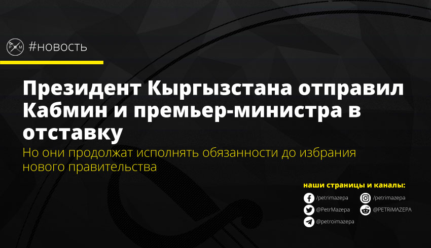 Президент Кыргызстана Сооронбай Жээнбеков подписал указ об отставке премьер-министра Кубатбека Боронова. Кабинет министров тоже в полном составе уходит в отставку, но они продолжат исполнять свои обязанности до назначения нового правительства.