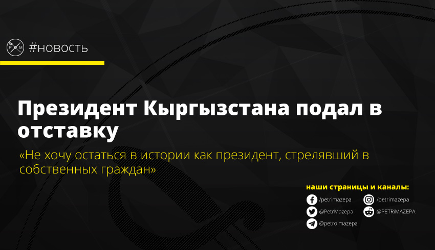 Он также заявил, что мир в Кыргызстане, целостность страны для него превыше всего. «Нет ничего дороже для меня жизни каждого моего соотечественника. Я не держусь за власть. Не хочу остаться в истории Кыргызстана как президент, проливший кровь и стрелявший в собственных граждан. Поэтому принял решение уйти в отставку», - заявил Сооронбай Жээнбеков и призвал премьер-министра Садыра Жапарова и других политиков увести своих сторонников с площадей и вернуть мирную жизнь в страну.