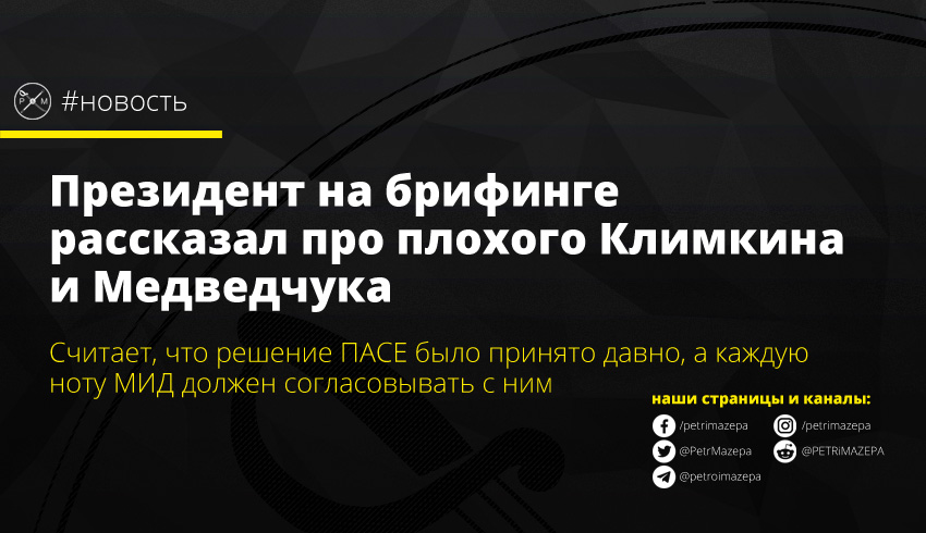 Президент Украины Владимир Зеленский созвал брифинг только для того, чтобы рассказать какой плохой у нам глава МИД Павел Климкин, который пишет ноту от лица Украине не советуясь лично с президентом. Также он ответил на два вопроса журналистов – о том, что решение про возвращение РФ в ПАСЕ было не изменить, и про сегодняшние шаги от Медведчука.